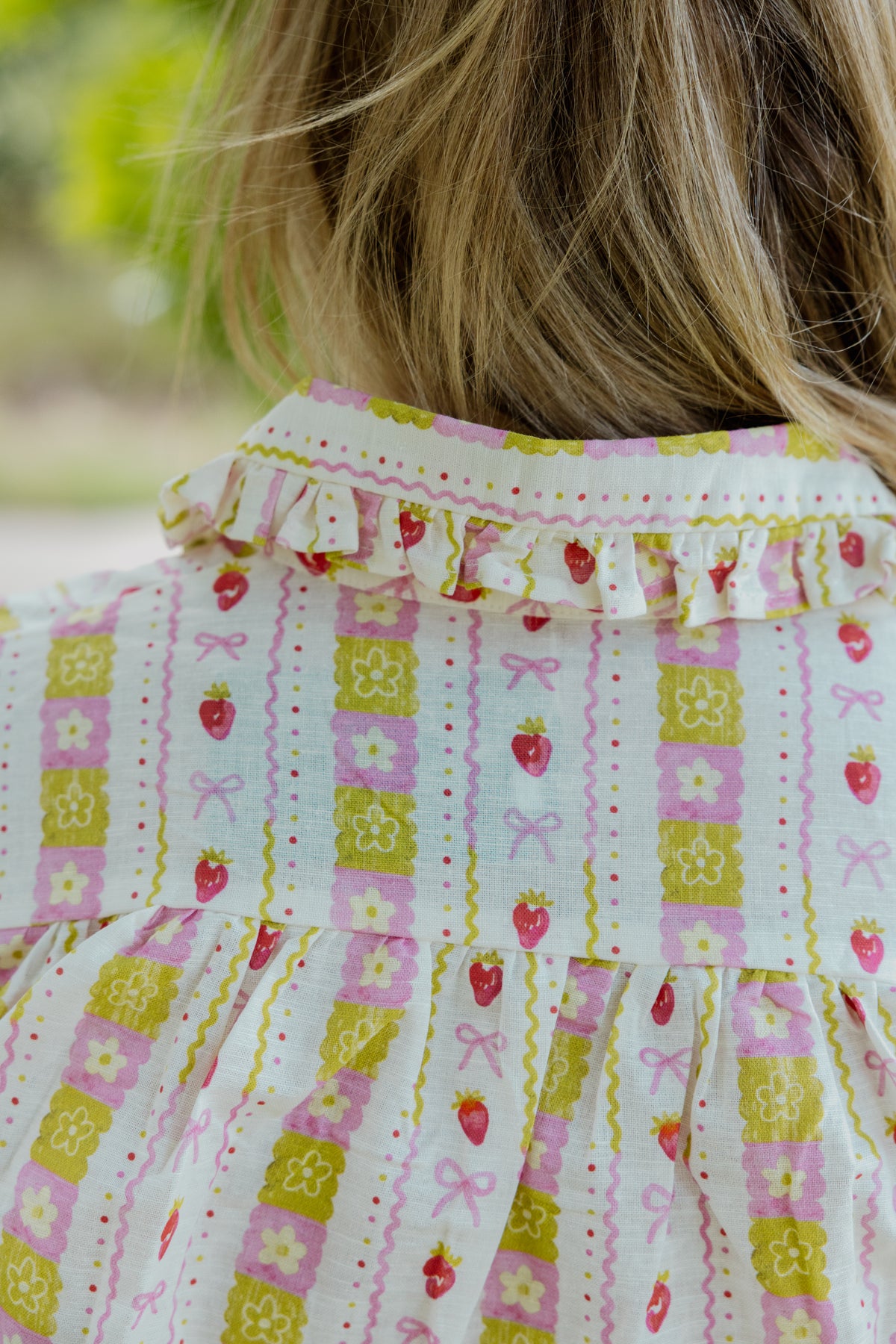 The Frankie Shirt in Berry features a striking ruffle collar and cuffed sleeves with full button closure. Its relaxed, flowing silhouette offers comfort without sacrificing style, while the exclusive summer print makes it a versatile warm-weather essential. Wear your usual size for the intended relaxed fit.
